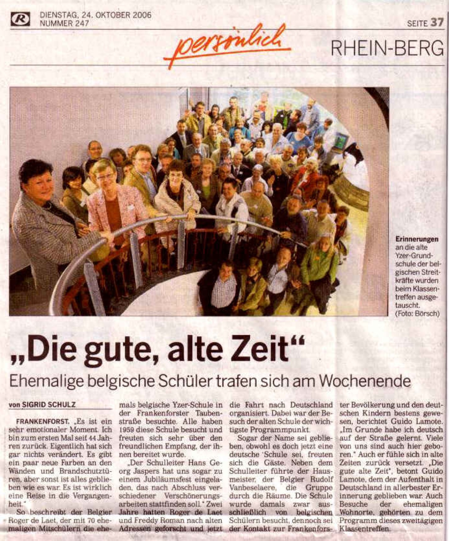 Eerst wil ik mij bij jullie allemaal verontschuldigen dat ik een niet zo goede spreker ben maar met papier en pen gaat dat al iets beter. Wij hopen in eerste instantie dat jullie allemaal veilig en wel zijn thuisgeraakt na dit leuke weekendje. Sta ons toe te mogen veronderstellen na al jullie positieve reacties ter plaatse dat onze reünie in de vorm van een weekendje Bensberg een groot succes was. Het grote succes van deze reünie was dan ook allemaal aan jullie toe te schrijven, het zijn jullie die het gemaakt hebben door jullie talrijke aanwezigheid en natuurlijk was de weergodin ons ook genegen. Natuurlijk is er altijd wel iets wat beter had gekund en daarom ook onze verontschuldigingen als er hier en daar een schoonheidsfoutje was. Nobody is perfect Natuurlijk hopen wij dat onze doelstelling “ Back in the time “ bereikt werd? Wij hopen dat jullie verloren gewaande vrienden na zovele jaren terug gezien hebben, dat jullie naar hartelust hebben kunnen bijpraten (waar wij niet aan twijfelen) en gegevens hebben kunnen uitwisselen. Persoonlijk voelden wij die warme aangename vriendschap die van jullie allemaal uitging heel goed aan. Wij BSD-kinderen hebben toch een speciale band naar elkaar toe of niet? Ook zijn wij ervan overtuigd dat jullie de eerstvolgende dagen nog veel zullen napraten over onze reünie maar wij hopen van harte dat dit verder mag blijven bestaan naar de toekomst toe. Daarom vragen wij jullie om ons jullie voorstellen en ideeën kenbaar te maken. Sluit jullie aan op onze nieuwe website en zie daarvoor alle uitleg op het eerste blaadje in het boekje dat jullie hebben gekregen. Alle mooie groep en of klasfoto’s die werden gemaakt heel graag doorsturen met de nodige tekst en uitleg AUB naar de mailadressen vermeldt op dat eerste blaadje in het boekje. Beste vrienden, nogmaals van harte dank voor alles, jullie zijn allemaal fantastische lieve mensen en vragen van verder onderling in contact te blijven. Carpe Diem (Pluk de dag)